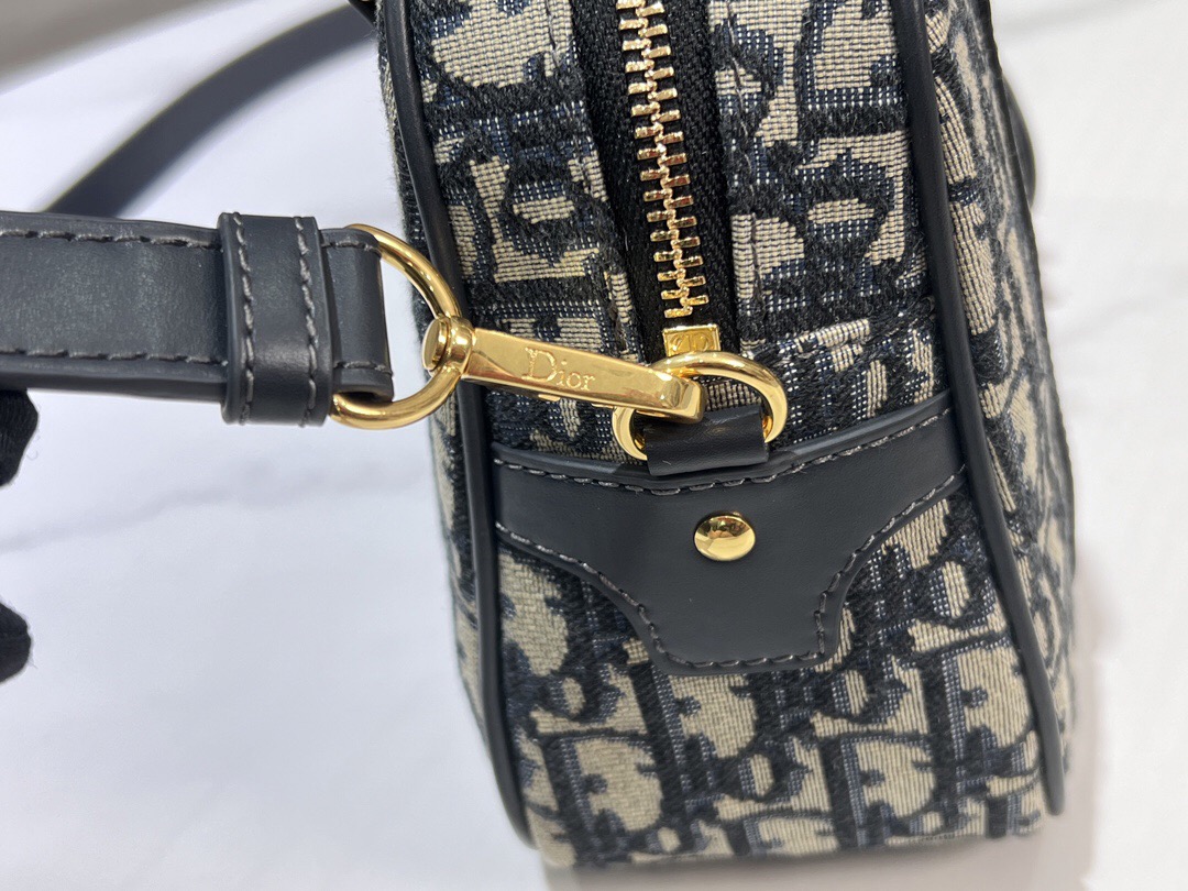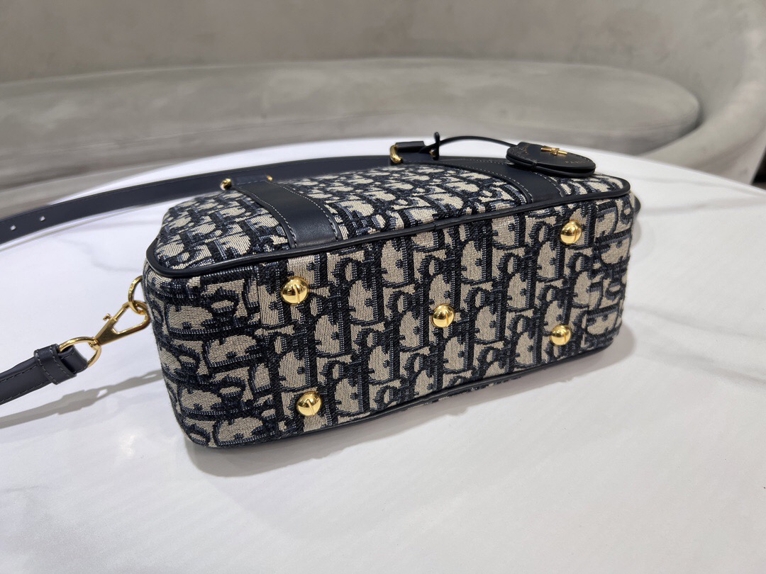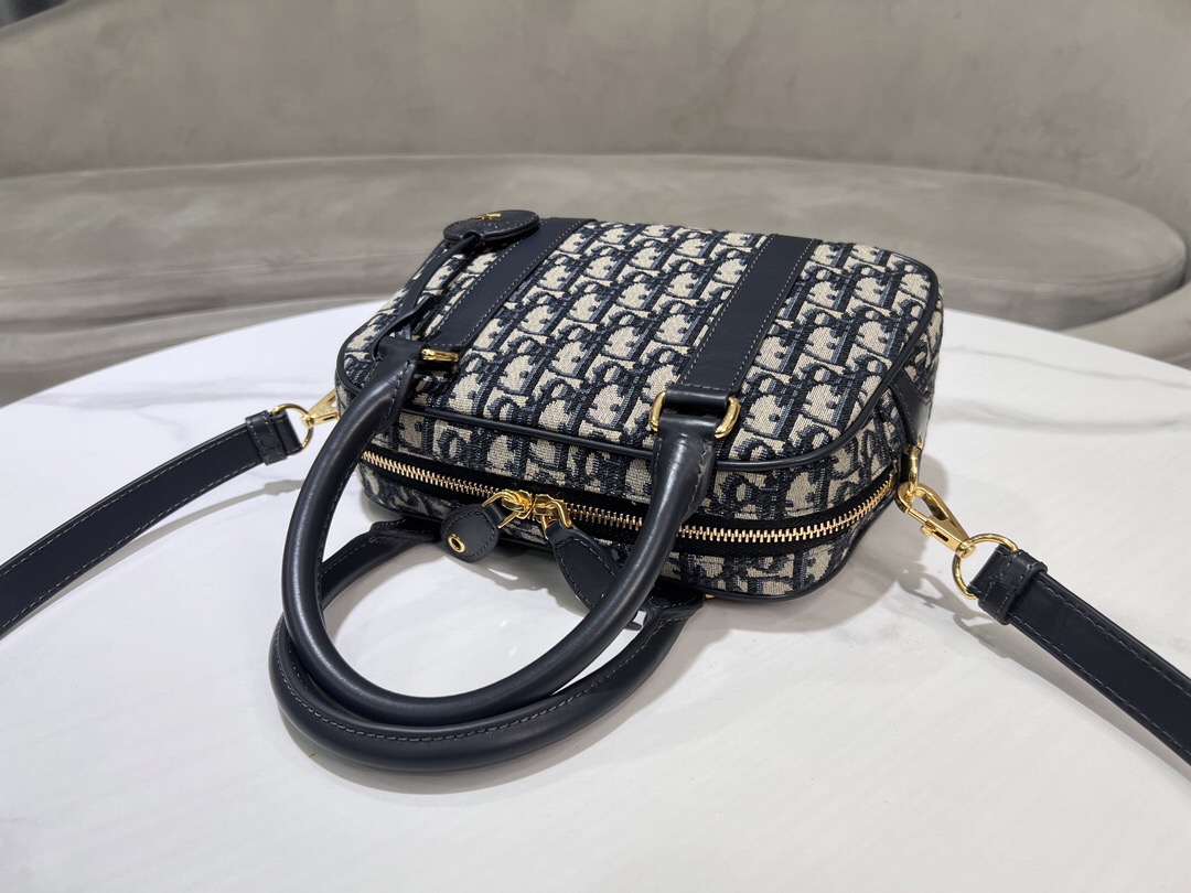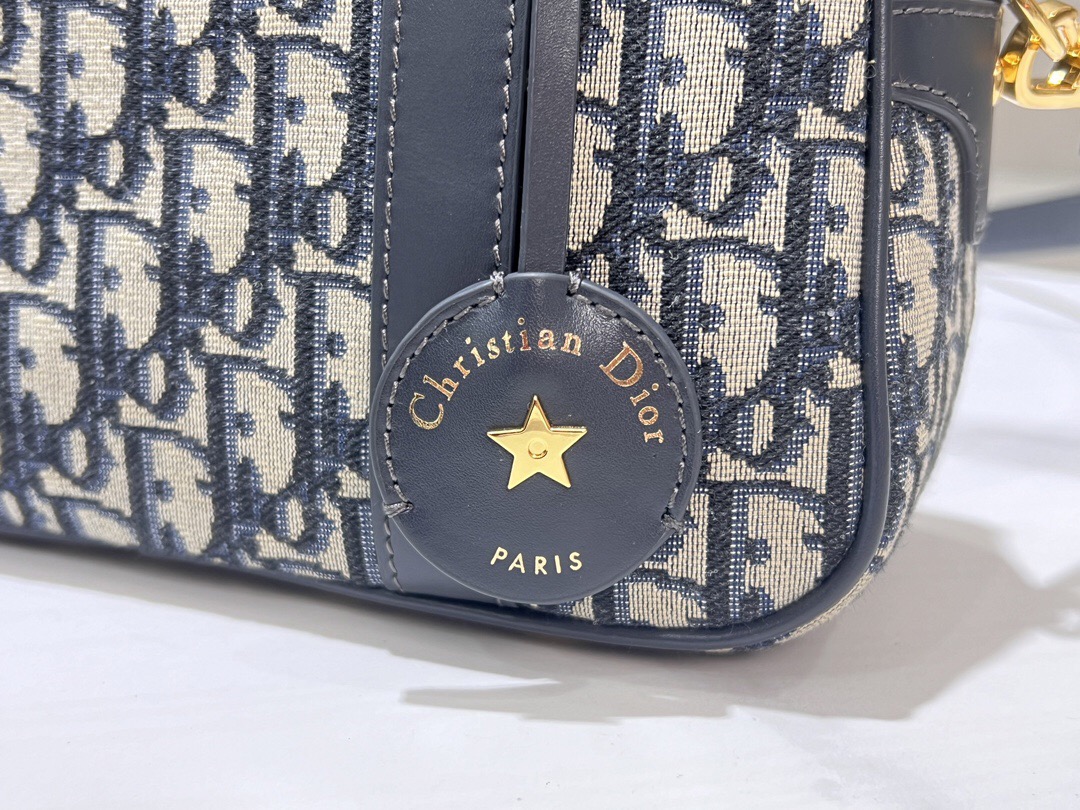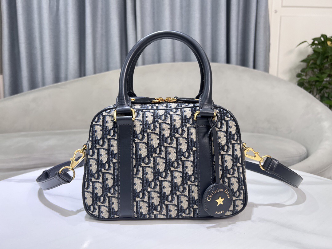 DetailNew for Fall 2024, the D-Vibe bowling bag has a streamlined and modern silhouette. Constructed in blue Dior Oblique jacquard adorned with tonal leather details, it stands out with a leather key holder engraved with the Christian Dior Paris signature and a gold-finish star. The attached key opens the zipper padlock to reveal a spacious compartment that can accommodate all the essentials, completed by a slip pocket and a zip pocket. Featuring leather top handles and an adjustable, removable strap, the practical medium bag can be carried by hand, worn over the shoulder or crossbody.