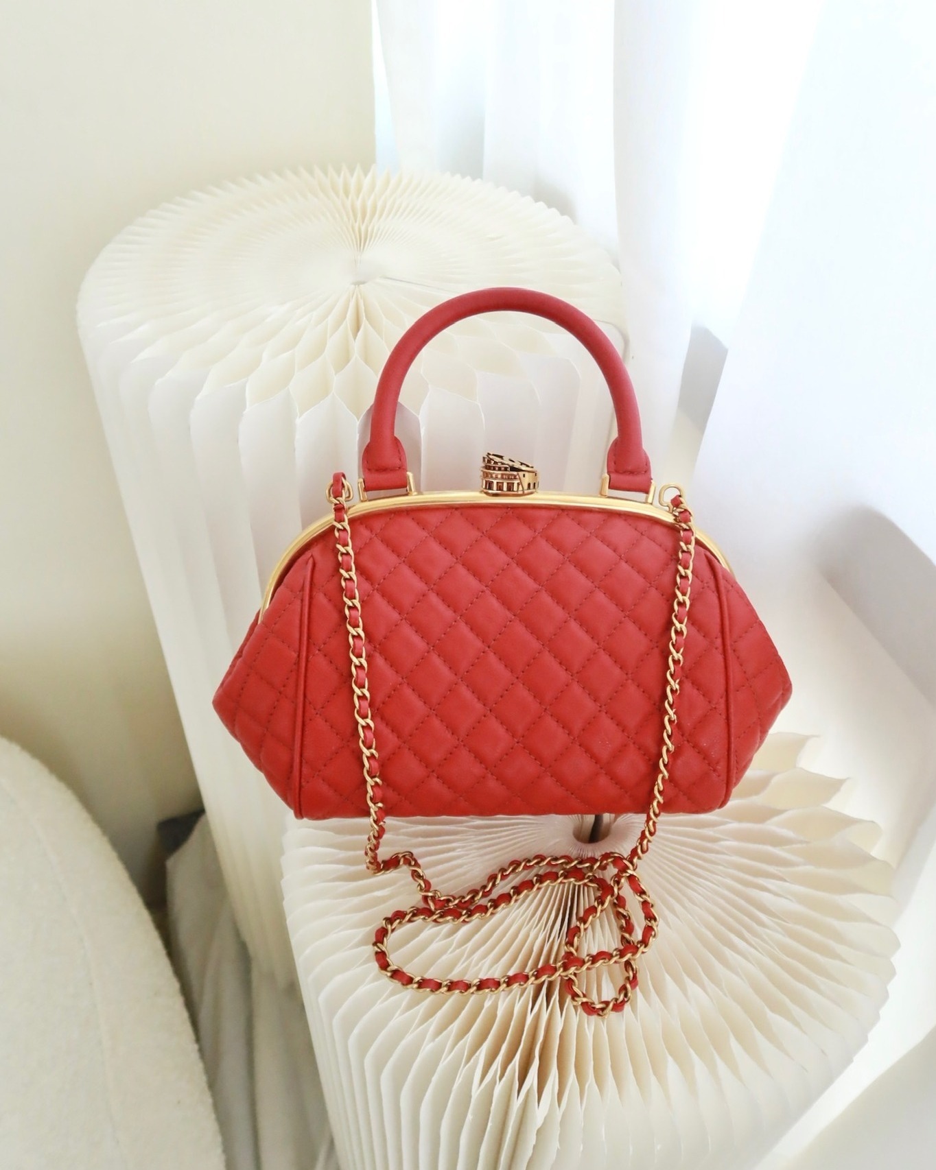 Chanel Quilted Kisslock Handbag With Chain Red Calfskin