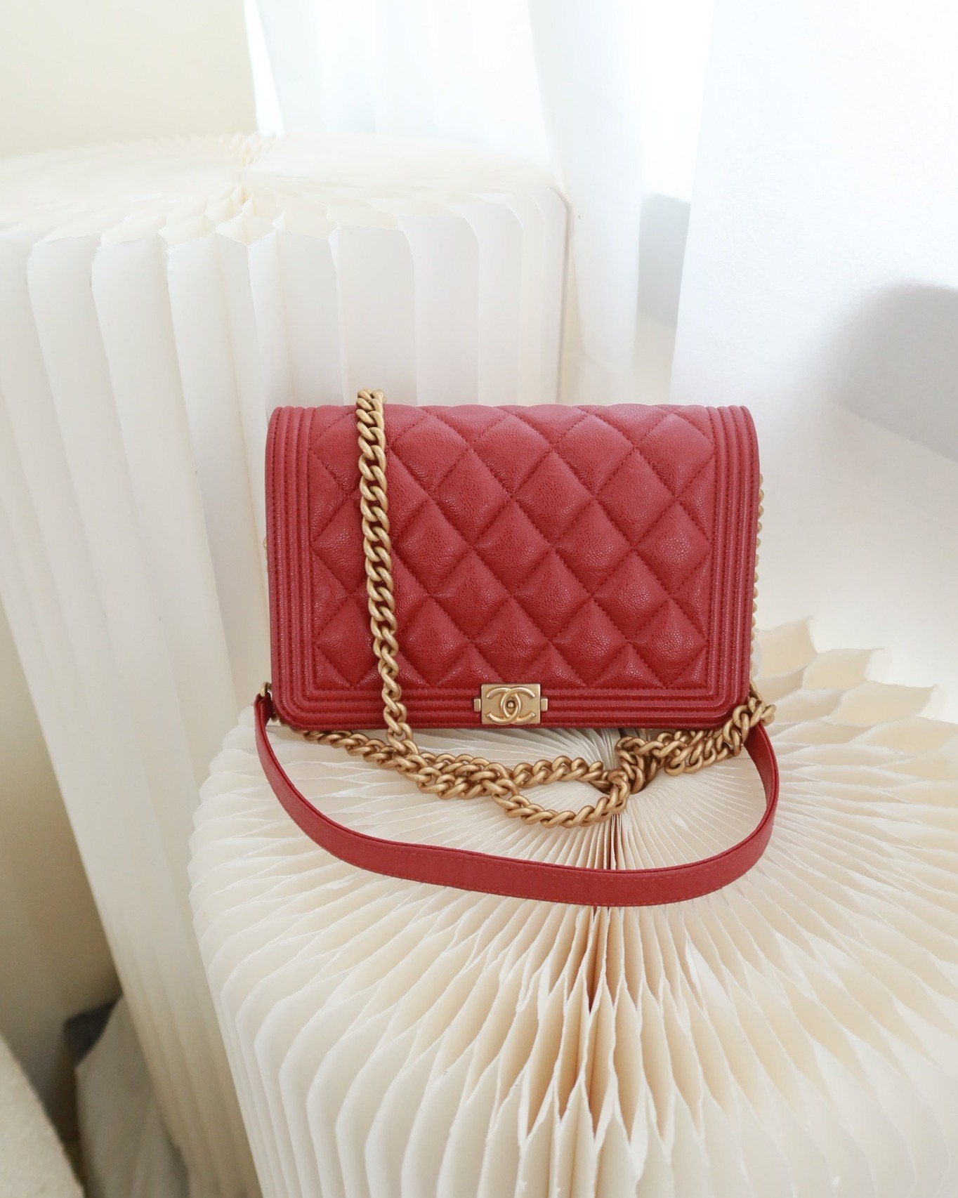 Chanel Quilted Boy Wallet on Chain WOC Red Caviar Aged