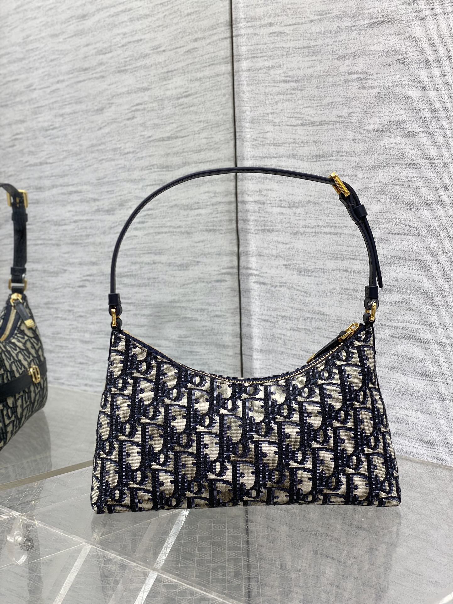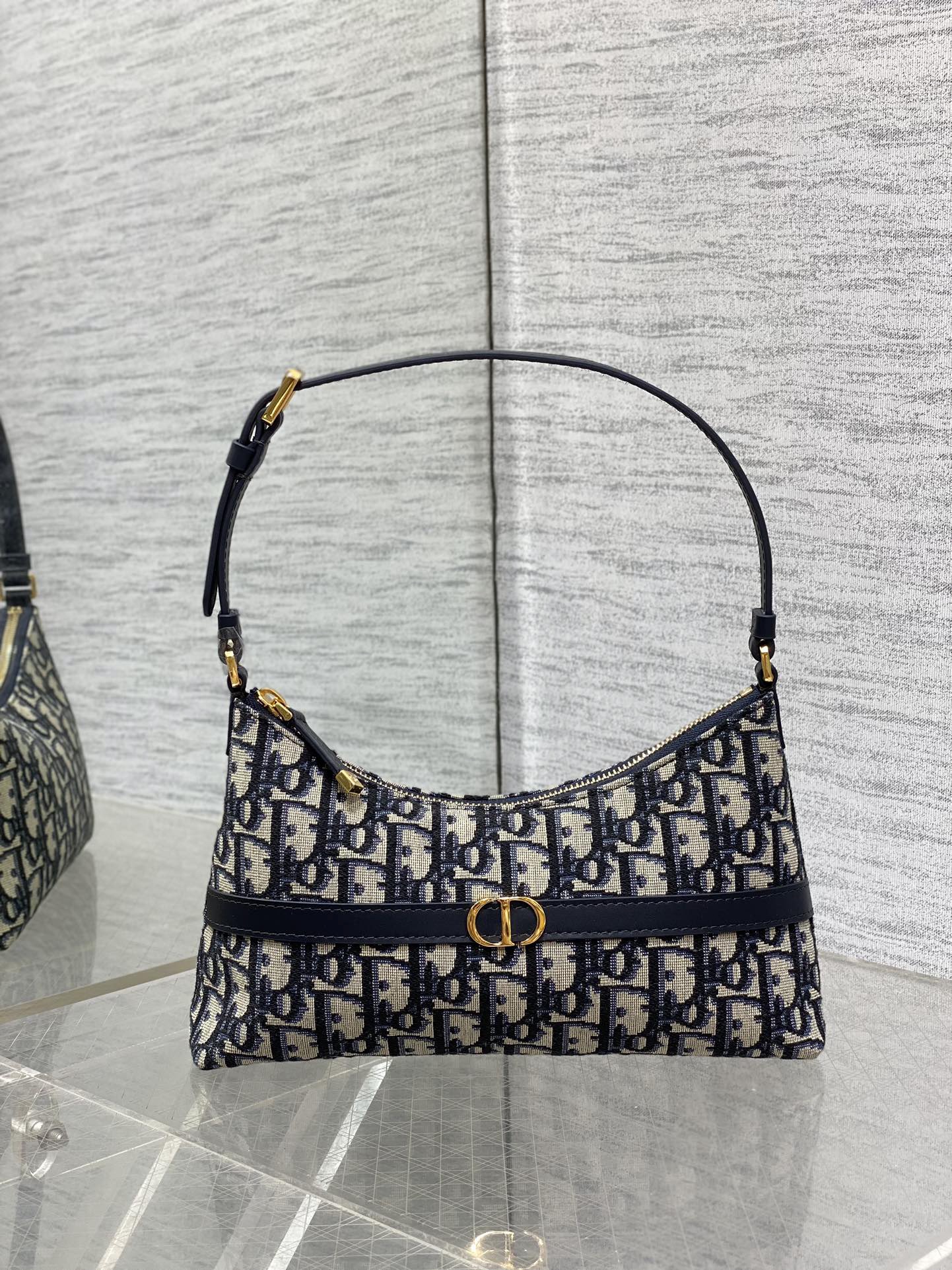 DetailNew for Cruise 2025, the mini hobo shoulder bag expands the 30 Montaigne line with a modern and refined creation. Made in blue Dior Oblique jacquard, it is distinguished by a decorative blue calfskin strap embellished with an antique gold-finish metal CD signature on the front. The zip compartment will hold all the essentials, while the adjustable leather strap allows it to be carried elegantly over the shoulder.