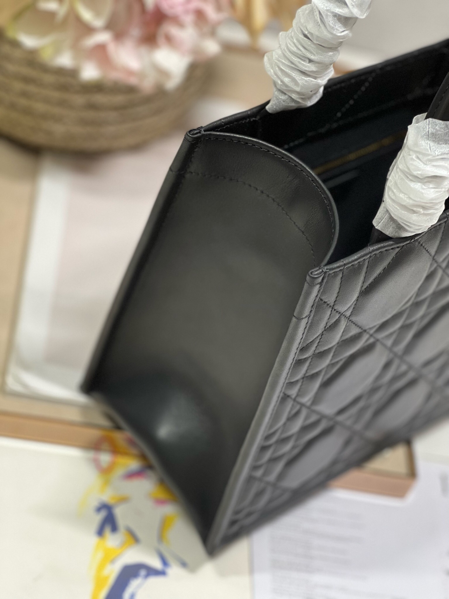 DetailMaria Grazia Chiuri's hallmark Dior Book Tote offers an original take on elegance. Crafted in black calfskin, the design showcases the Macrocannage motif and is embellished with pale gold-finish metal D.I.O.R charms on one of the handles. The cashmere leather interior reveals a zip pocket and patch pockets, ideal for organizing all the daily essentials. Featuring an adjustable and removable strap, the lightweight and practical small tote is a prime example of Dior savoir-faire and may be carried by hand or worn over the shoulder.