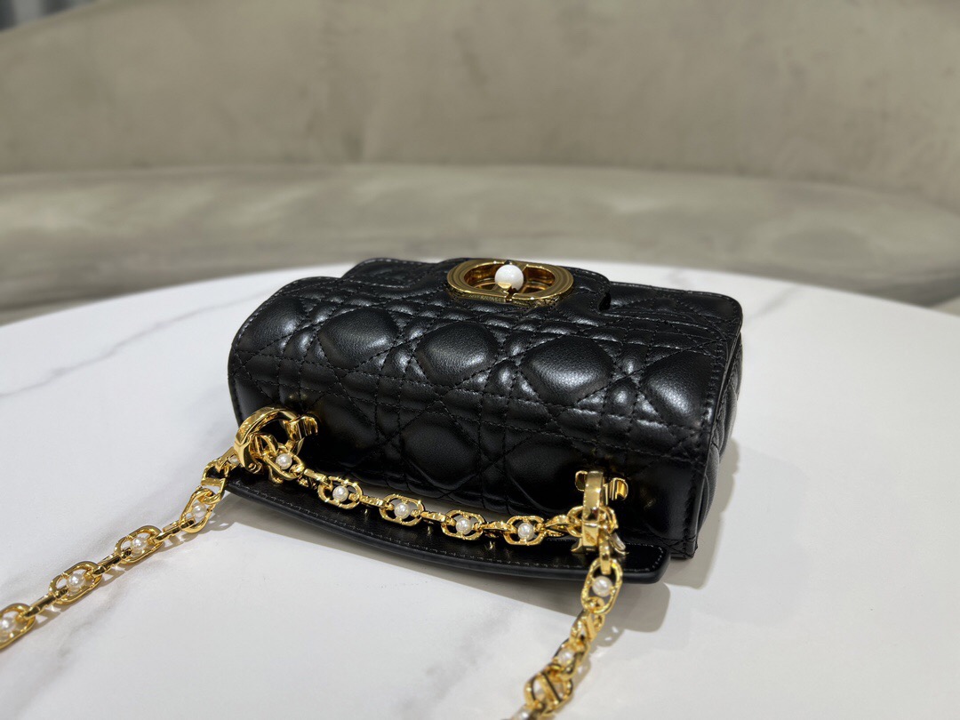 DetailNew for Summer 2024, the Dior Jolie Top Handle bag presents an elegant and functional design. It is crafted in black calfskin with Cannage stitching and features a double flap enhanced by a CD signature embellished with a white resin pearl, as well as three compartments and a zip pocket to accommodate all the essentials, day or evening. The removable top handle is completed by a detachable chain strap with a leather insert and CD signature links embellished with white resin pearls, allowing the miniature bag to be comfortably carried by hand, worn over the shoulder or crossbody.