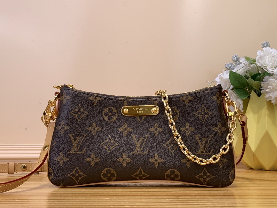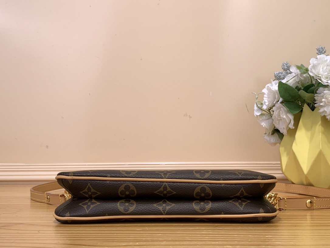 The Liv pochette in Monogram canvas is designed to fit snugly under the arm. It comes with a detachable gold-tone chain and a removable, adjustable double strap in Louis Vuitton's emblematic natural cowhide leather. A secure, double-zip closure and an engraved, gold-tone plaque finish this stylish piece.